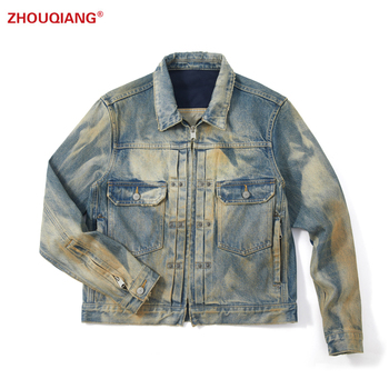 OEM Custom Autumn Men's Denim Jackets & Coats High Quality Cotton Pockets With Zipper Vintage Heavy Washed Jeans Tops